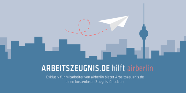 In unserer Aktion: arbeitszeugnis.de hilft airberlin bieten wir den Mitarbeitern von airberlin eine kostenlose schriftliche Analyse ihrer Arbeitszeugnisse an, welche sie über die prägnanten Auffälligkeiten im Zeugnis informiert. Dies bietet den Betroffenen die Möglichkeit, bei festgestellten Mängeln einen berechtigten Korrekturanspruch gegenüber dem Arbeitgeber geltend zu machen und so im Idealfall ein Zeugnis zu erhalten, das den aktuellen gesetzlichen Anforderungen an Arbeitszeugnisse entspricht.